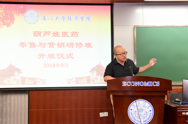 在开班仪式上,廖景峰主任首先代表厦门大学经济学院热烈欢迎抖圈医药零售与营销研修班的学员到厦大学习,并就厦门大学及经济学院的相关情况进行了介绍。他说,抖圈学员走进厦大就是厦大的校友,希望未来的日子能够关心、支持母校的发展,多提宝贵意见,同时他也祝大家在厦大学习期间学有所成、学有所获。